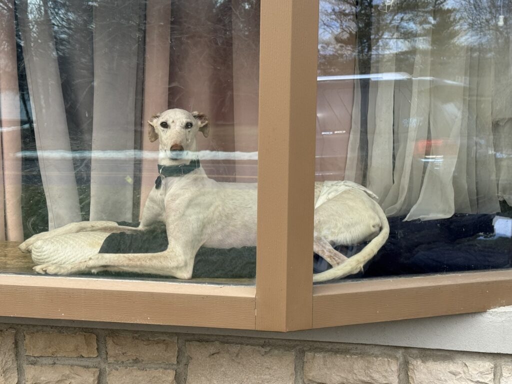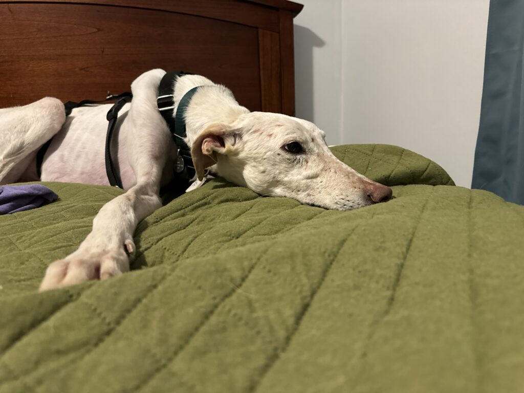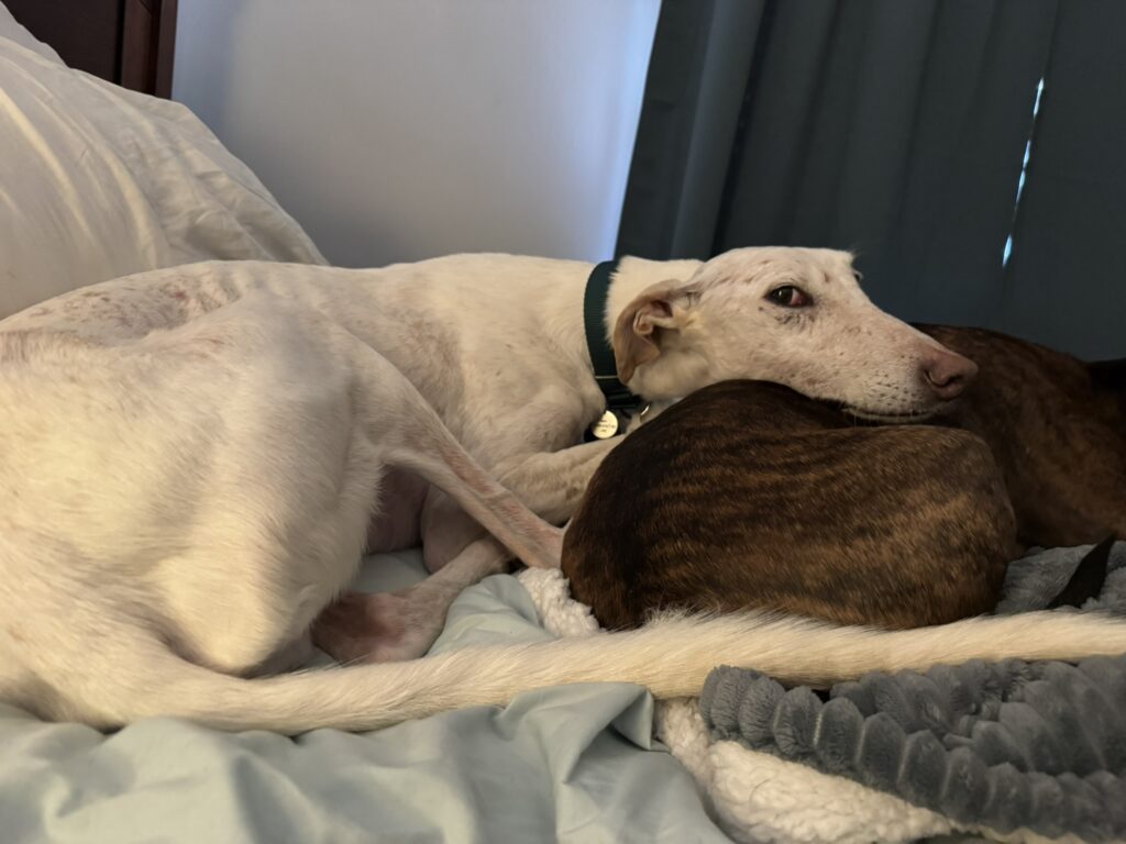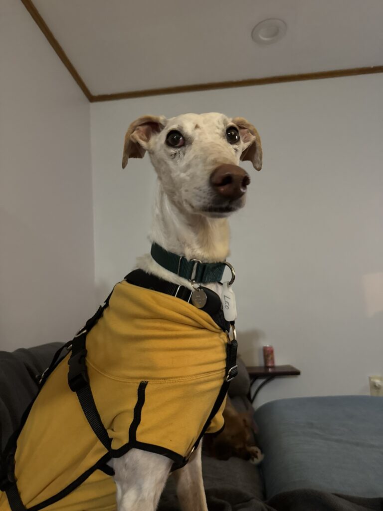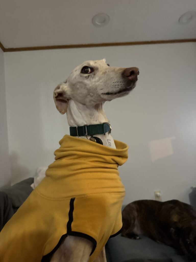 Leo is a sweet galgo who arrived from Spain in February 2026. He is 8 years old, and his birthday is listed as October 12. Leo is a handsome boy who looks very dapper in a sweater. Foster Mom Shelby says Leo is a wonderful boy who is easy on the leash and an expert at finding the comfiest spot on the couch or bed. He also loves to show her where all of the bunnies are hiding in the yard and on walks!