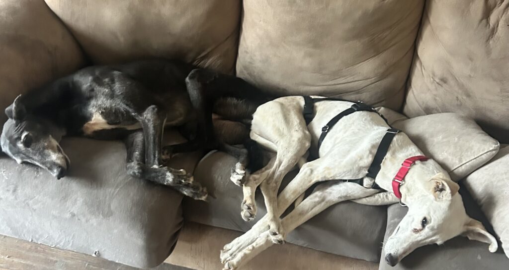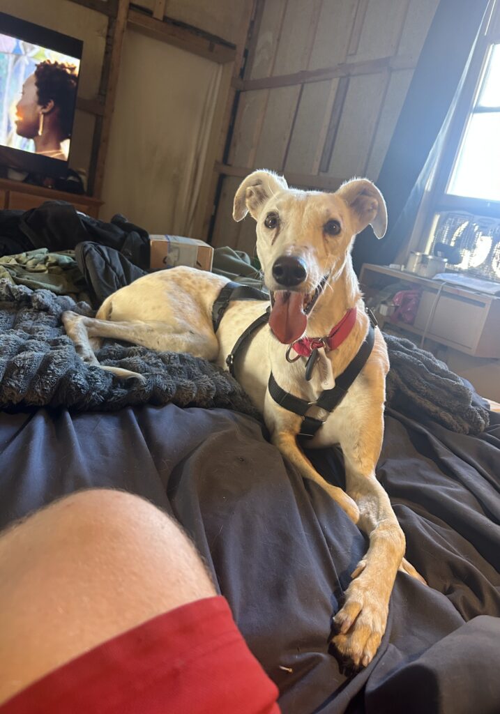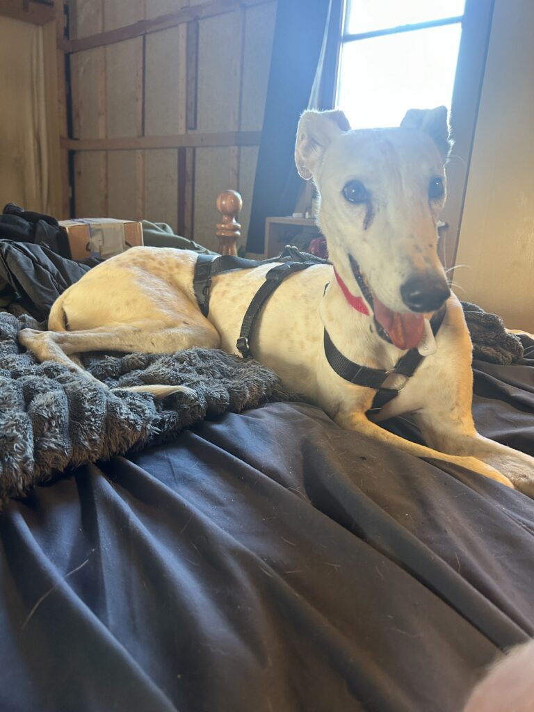 Palomo is a Spanish galgo who recently turned 6! He is good with cats and other greyhounds, as well as kids. He has been doing well since arriving in foster care, although is still an early riser – he will get up around 5:00 am or so and urgently need to go outside. He walks well with a leash but would run if spooked or given the opportunity, just like most galgos, so it is important to hang on tight!