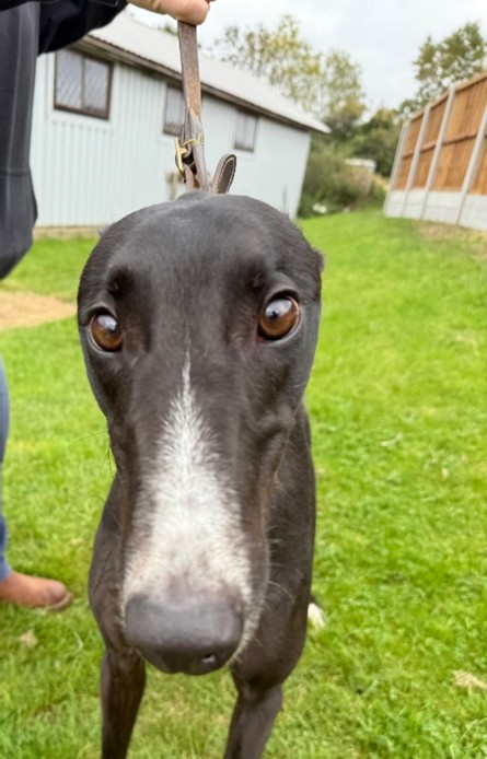 Meet Spinner! This sweet boy is three and a half years old, born April 21, 2022. He arrives to the US on October 30. A former UK racer who ran 21 races under the name Kohinoor Spinner, he was retired on July 12 due to a minor wrist injury (described as “more of a niggle” than a true injury, but better safe than sorry at greyhound speeds!) Spinner is all healed up now, and is a kennel “favourite” at Romford.